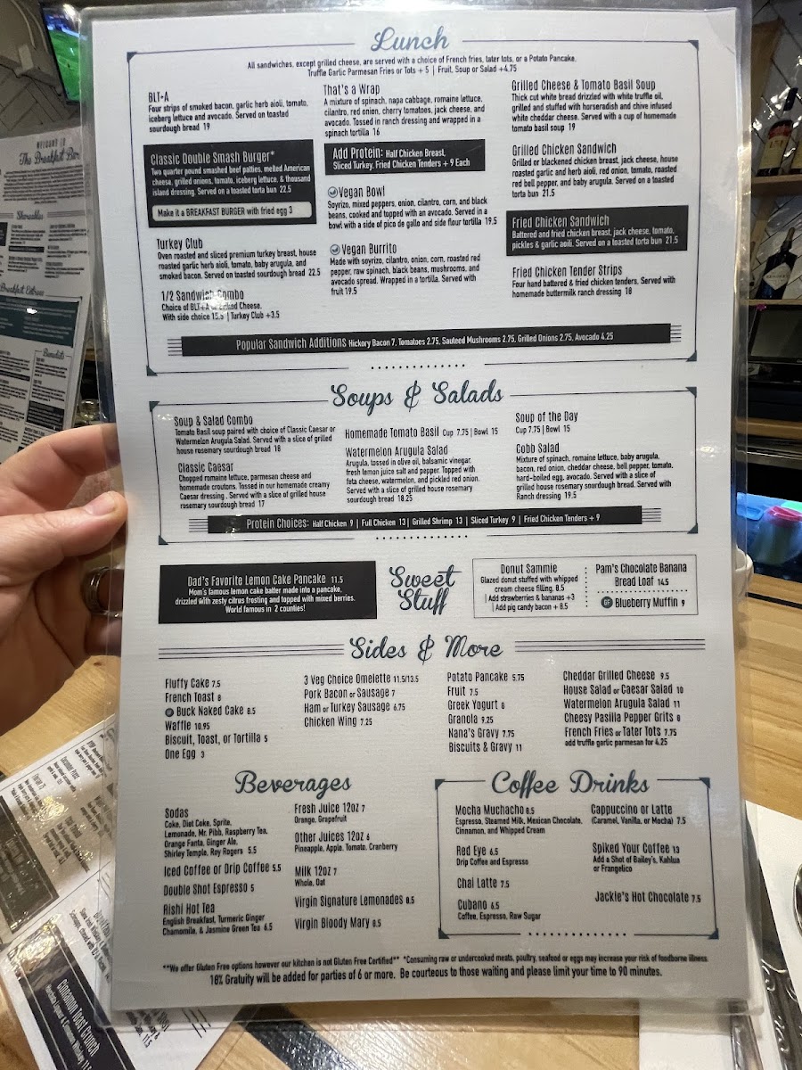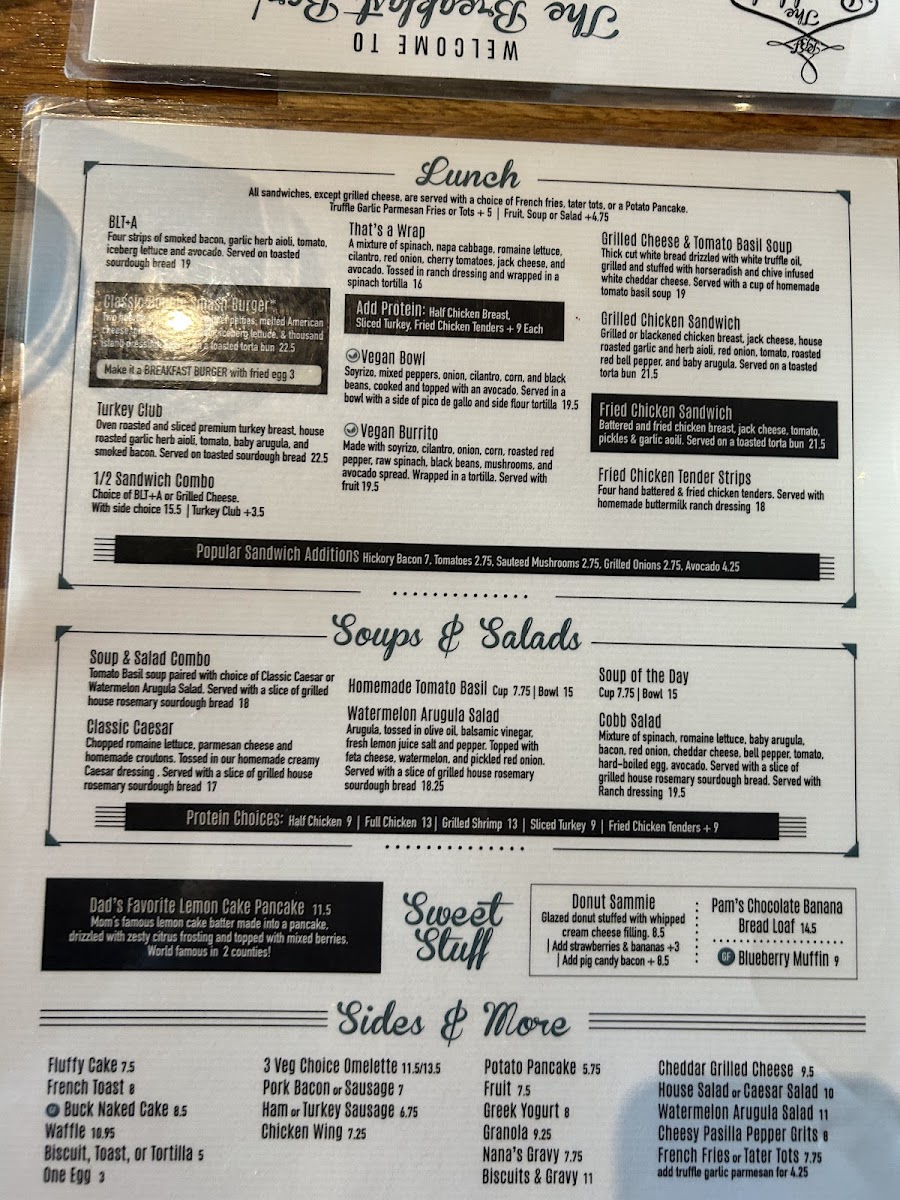 Full chicken breast battered in corn flakes cereal. Smothered with nana's pork sausage gravy and topped with two eggs cooked anyway you like. served with biscuits and potato pancake.
